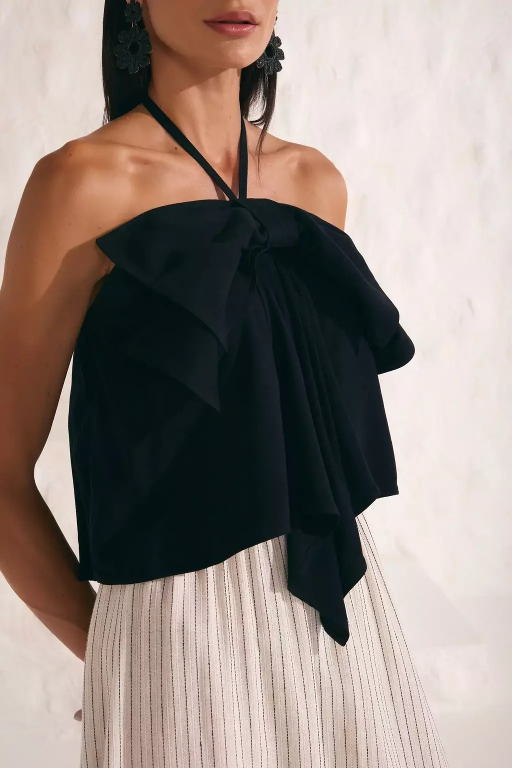 Blusa Linzzi: Confeccionada em blend de viscose, oferece leveza e frescor para o Alto Verão 26. Destaque para o maxi laço e decote costas com elástico, garantindo estilo e ajuste perfeito. BLUSA : 100% VISCOSE